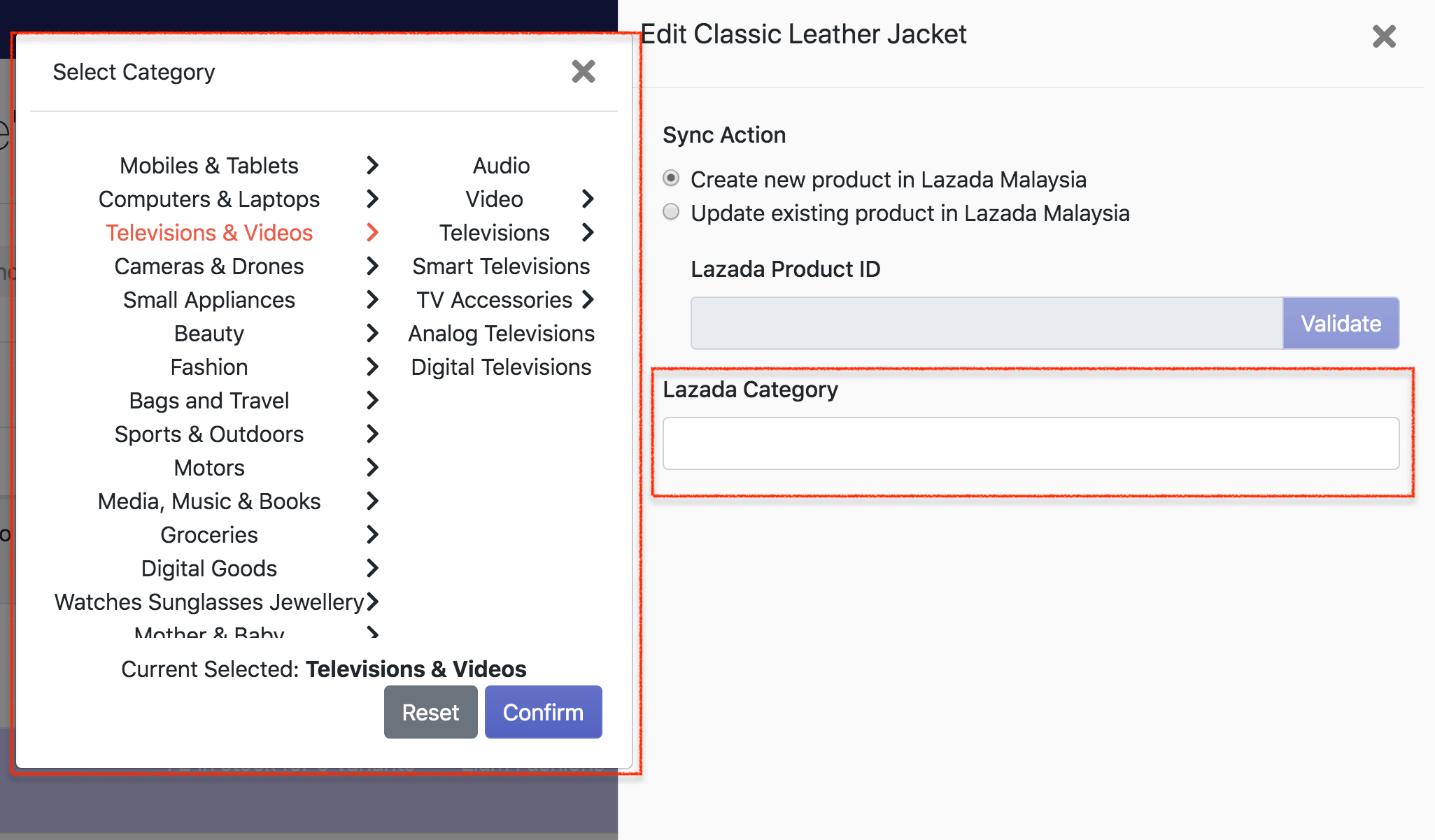 - Click Lazada category input. Select the category for the product, click confirm and save.