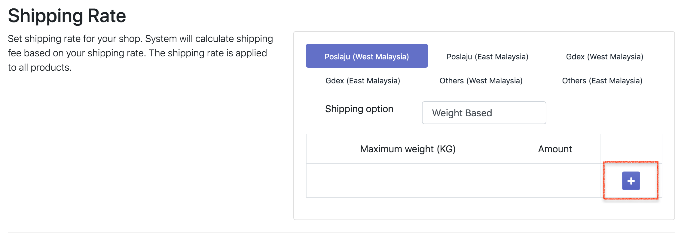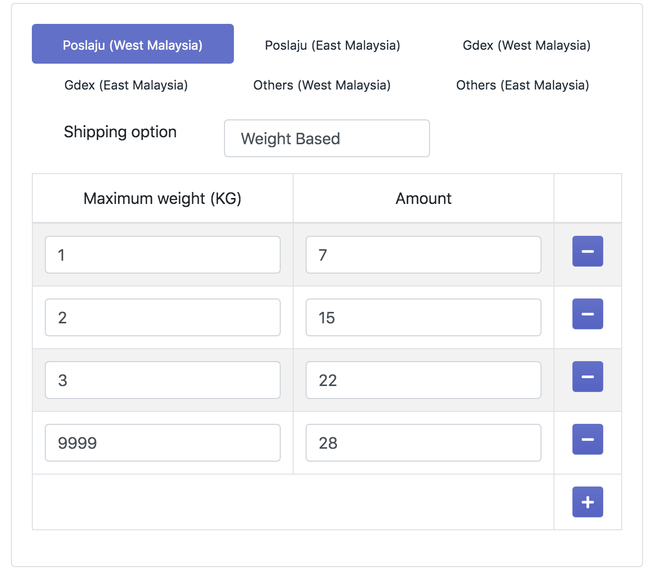 - From the shipping options dropdown, select weight based or flat rate option. For flat rate, you just have to enter the amount. For weight based, you need to enter the maximum weight and the amount. Click the “Add” button to add.