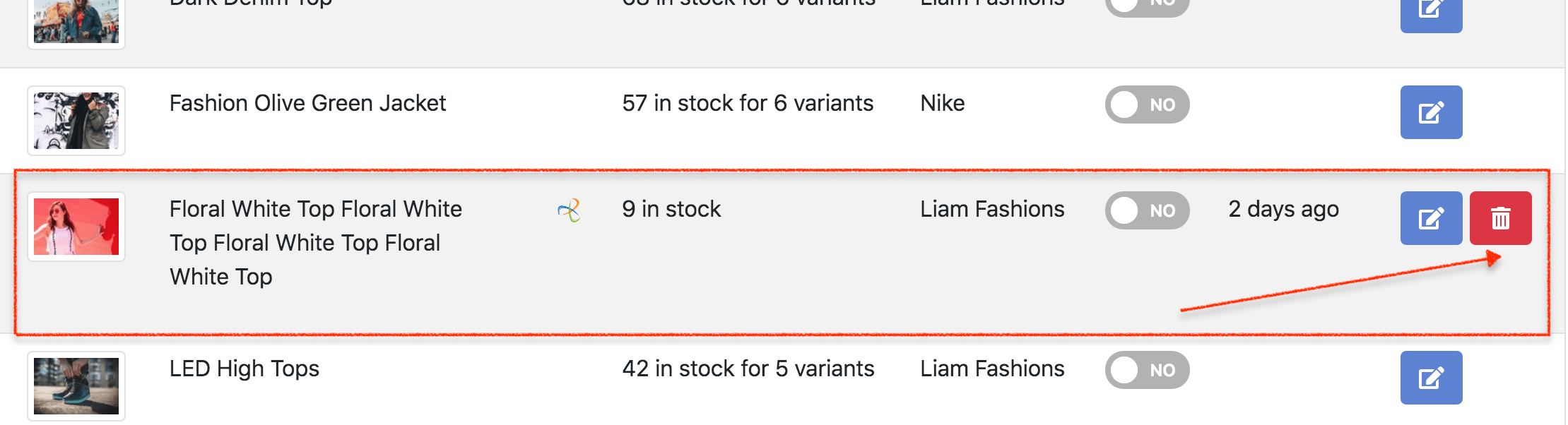 2. Find for the product you want to delete. In the action, click the “Trash” icon.