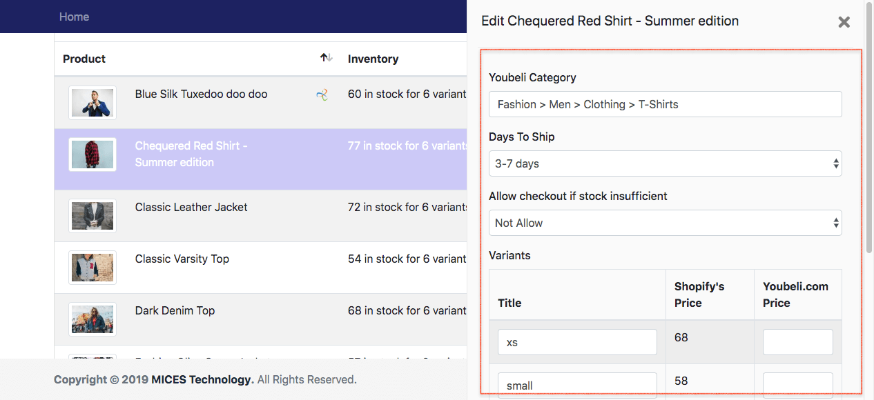 3. Select Youbeli category for the product and fill in other fields in the form like days to ship, variants price, etc. Click “Save” to save the info.