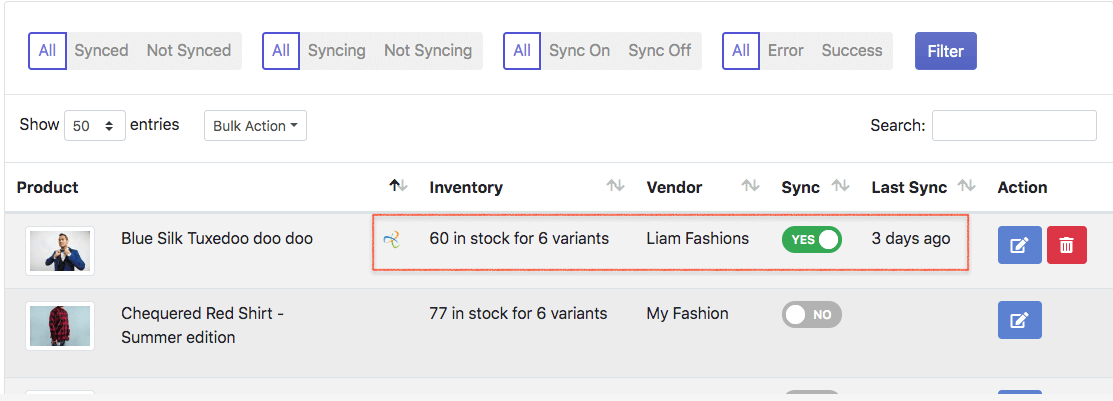 4. To sync a new product, turn ON the “sync” button. You will see a spinner is loading, this means the syncing is in progress, you are safe to leave the page.