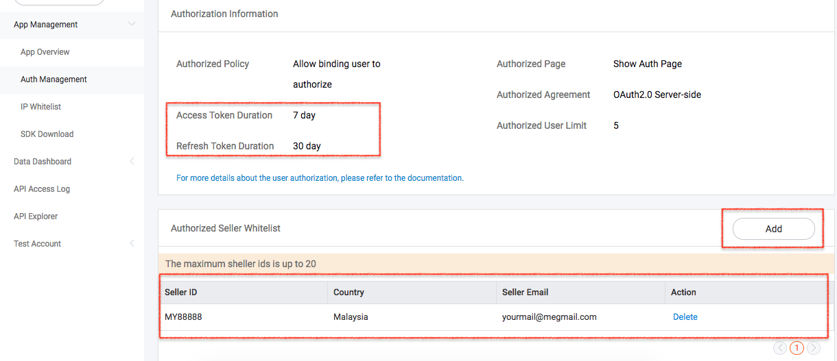 8. Next, click “Auth Management” in the left menu. You need to authorize your seller account to use this app in order to make sync working. You can check access token maximum duration and refresh token maximum duration here. To authorize your seller account to use app, click “Add”. Enter your seller ID, country, seller email and password. You can obtain seller ID from Lazada seller center profile. Then, you can see your seller account listed in “Authorized Seller Whitelist”. Next configure MICES SyncGo for Opencart – Lazada in Opencart or install MICES SyncGo for Opencart – Lazada extension.