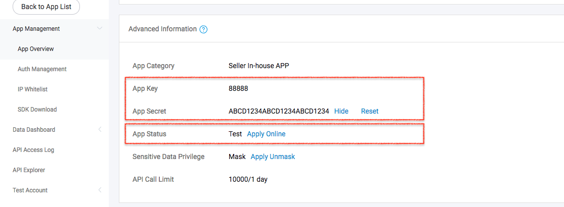 7. Scroll to “Advance information” in App Overview, you can see your App Key, App secret. You will need this 2 to configure MICES SyncGo for Opencart – Lazada. Your app status will be in “test” mode. To make it “Online” click “Apply Online”, you need to fill in some details. The purpose of apply online is to increase the duration of access token and increase the API call limit.