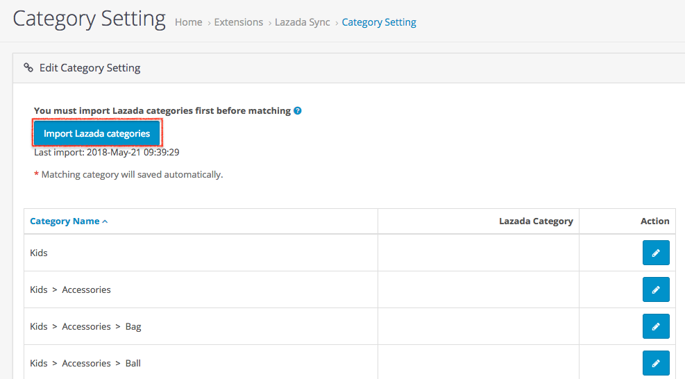 Click “import Lazad categories” to fetch all Lazada categories. Lazada may update their category without notice, you may click again to import latest categories.