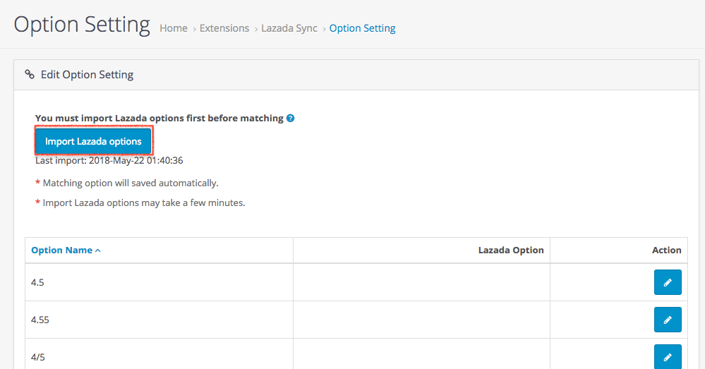 Click “import Lazada options” to fetch all Lazada options. Lazada may update their options without notice, you may click again to import latest options.