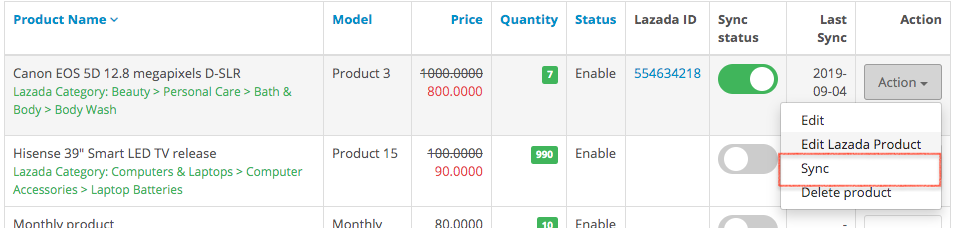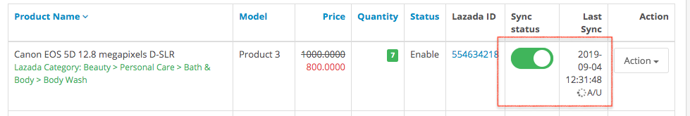 To manual sync product, toggle on the sync status, then click the “Action” button and click “Sync”.