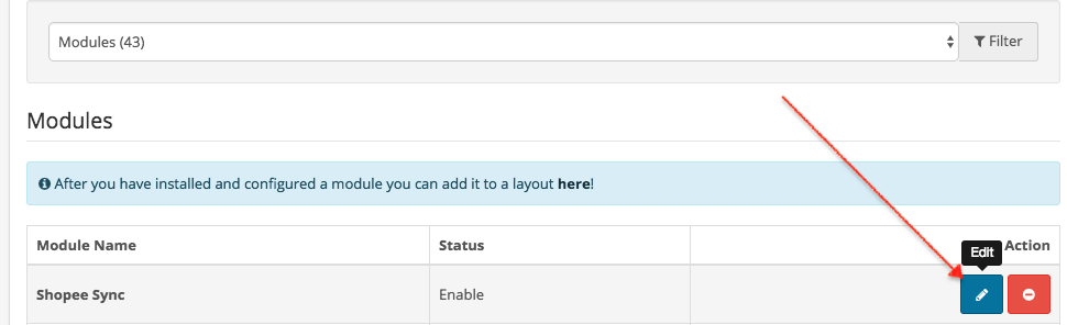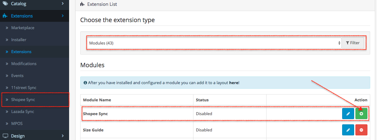 - After uploaded, go to Extensions -> Extensions -> Choose “Modules” extension type, you will see “MICES SyncGo for Opencart – Shopee”. Click “install” button