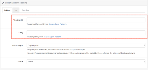 - Enter Partner ID, key you obtained from Shopee Open platform and enable the extension. You can also set price sync to Shopee(Original price or Special price). Finally, click save, you will redirect to Shopee Open platform authentication page.