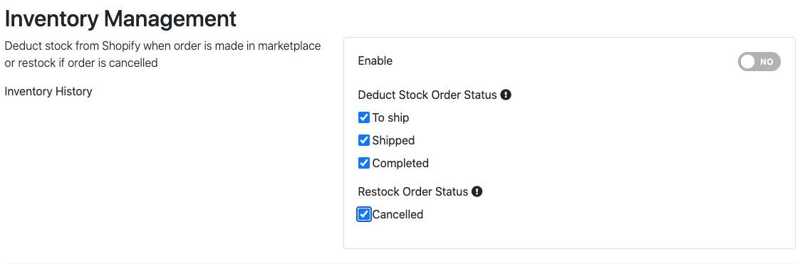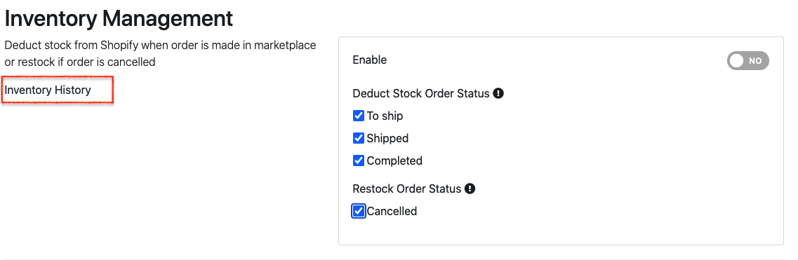 - In the Shop’s setting, Enable the inventory management, select order status to be deducted and order status to be added back to inventory. Please note that MICES SyncGo will restock only if the inventory is deducted.