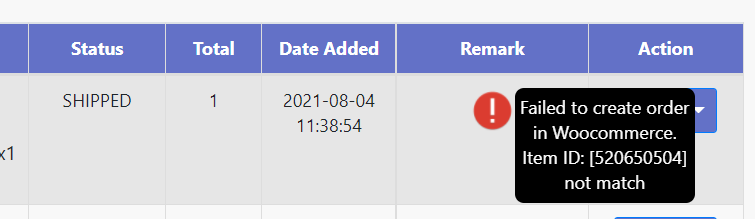 If the order cannot found the same item in Woocommerce, it should display as below: